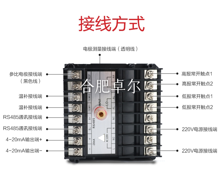 - 具备PH/ORP测量、温度测量、上下限控制、变送输出、RS485通讯功能